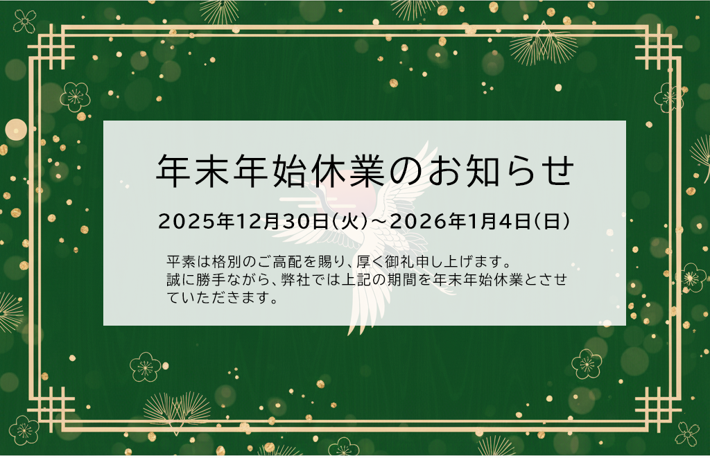 平素は格別のご高配を賜り、厚く御礼申し上げます。 誠に勝手ながら、弊社では下記の期間を年末年始休業とさせていただきます。 <営業> 休業期間: 2025年12月30日(火)~2026年1月4日(日) ご不便をお掛けいたしますが、何卒よろしくお願い申し上げます。